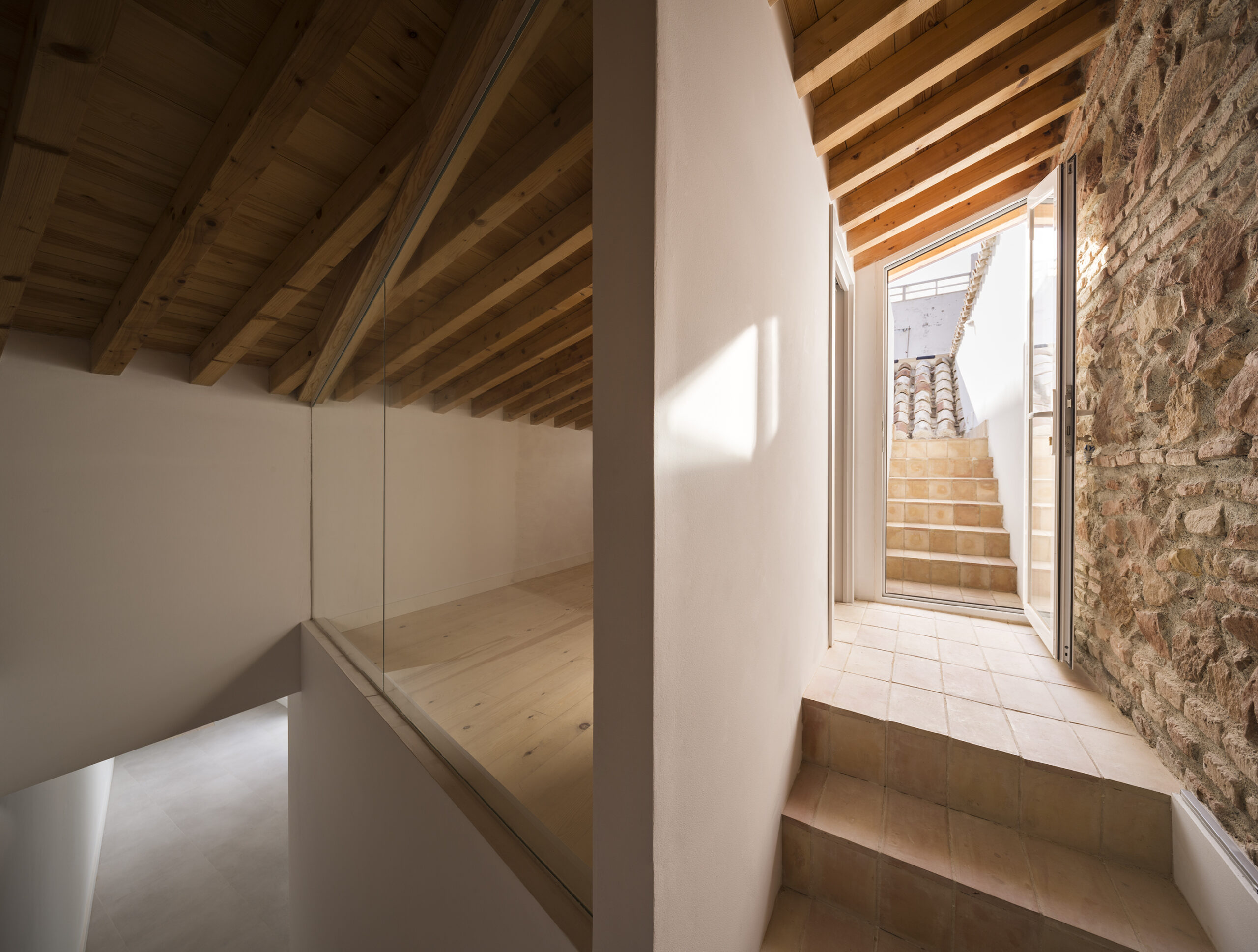 The new homes are three-dimensionally intertwined creating a formless twinning within the existing spatial container that develops on the two floors from the entrance, the patio, the galleries, the halls with high wooden ceilings, the two facades and the roof terraces, providing them of the virtues that these places have brought to life in the houses since its origin. The walls, floors and roofs are preserved and the new materials introduced are manifested through a constructive honesty of colored metal profiles and pinewood floors, accentuating the contrast between the original and the new.
