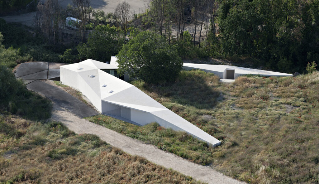 Por un lado, la ruina de un antiguo caserío determina la posición del proyecto. Este lugar es estratégico, en la esquina de la parcela, ya que maximiza la superficie de cultivo al dejarla libre de recorridos. Se trata de construir en lo construido minimizando el impacto en el territorio. La ruina determina parte de la geometría de la propuesta ya que ésta se constituye en el negativo de los elementos murarios preexistentes, rodea los mismos y dialoga con los cambios de nivel (de hasta 5 metros existentes en este punto) convirtiéndose en topografía. Como ruina, el proyecto se convierte en un muro de perfil discontinuo, inestable y fragmentado.