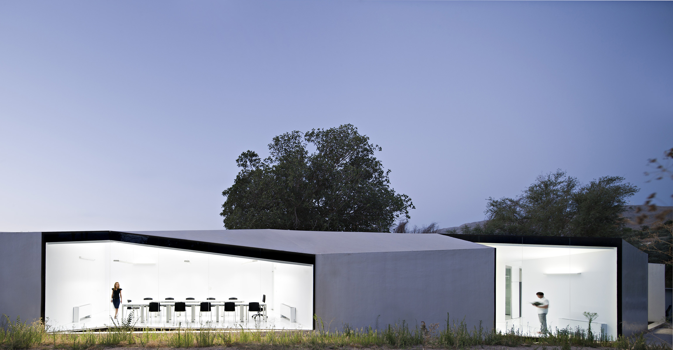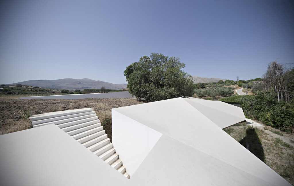 La gran higuera preexistente, de más de 50 años, adquiere un papel protagonista en la intervención. El proyecto la abraza y la convierte en referencia visual y ambiental desde el interior. La topografía blanca subraya la posición de este elemento en el paisaje.
