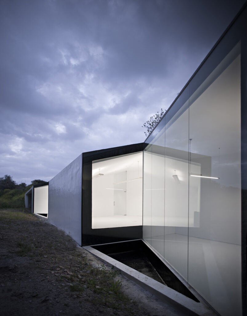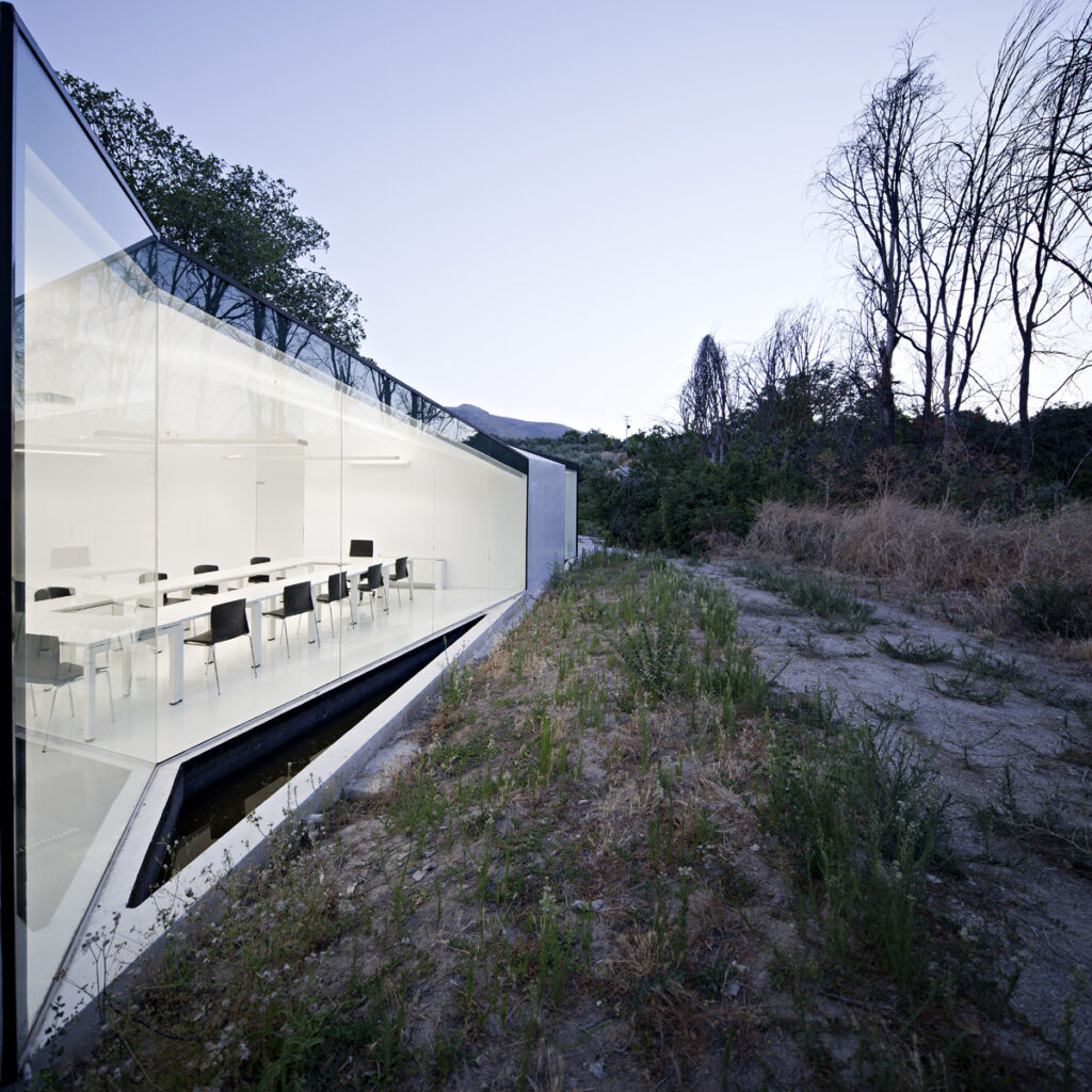 El entorno, el arroyo, la vegetación de ribera así como las casas agrícolas de alrededor penetran en el edificio a medida que el paisaje se introduce en el interior gracias a la disposición  geométrica de los distintos planos reflectantes y opacos, y sus ángulos de reflejo. Se multiplica así la experiencia del interior que se disuelve en exterior a medida que recorremos el proyecto.