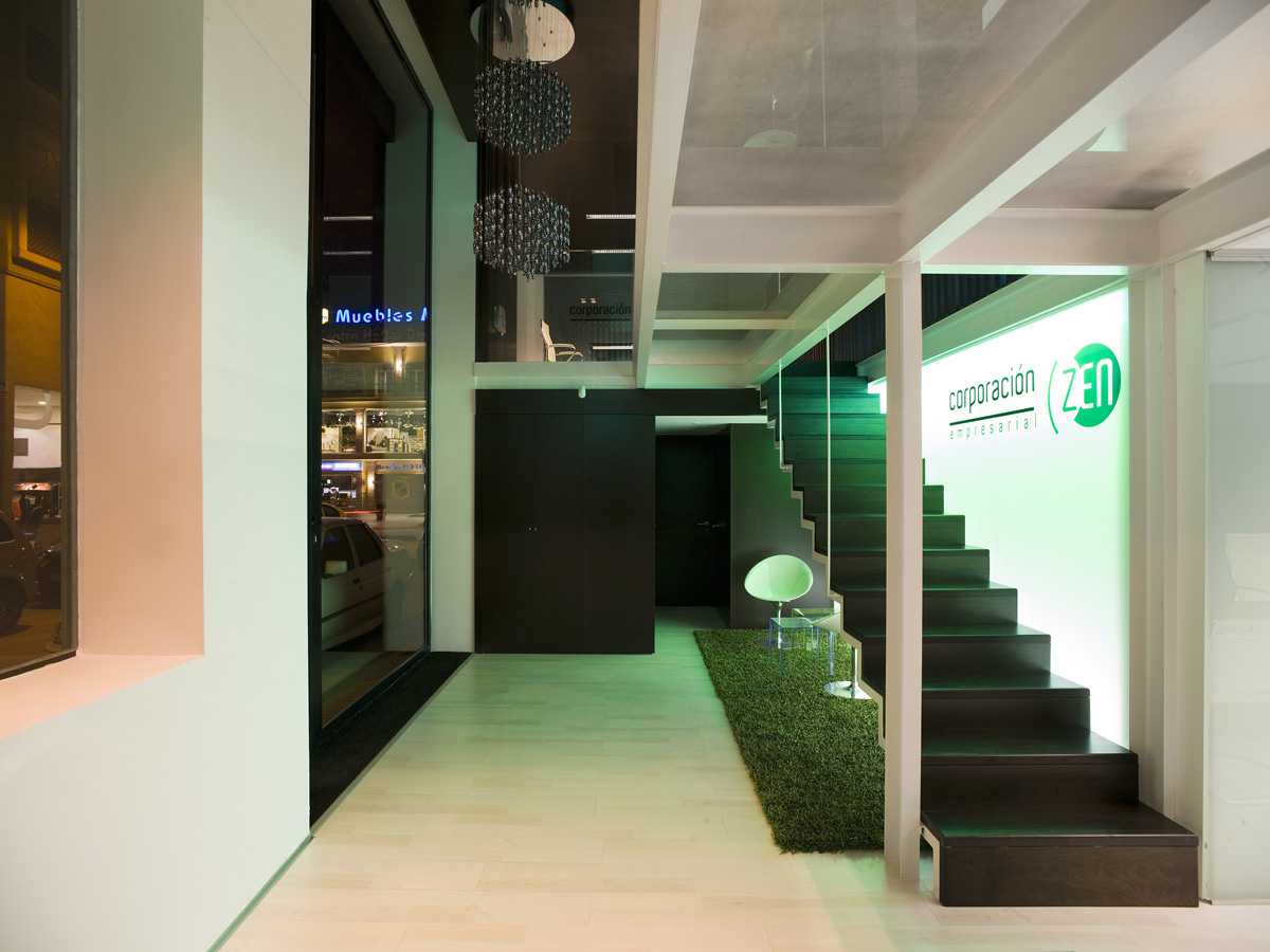 Las nuevas Oficinas de Corporación Zen están ubicadas en un bajo comercial de 5.2 m de altura y en forma de L. El proyecto plantea el aprovechamiento óptimo de la altura del local proponiendo un altillo de estructura metálica colocada estratégicamente y sin ocupar la totalidad del local. Ello permite cualificar los espacios y establecer relaciones visuales en altura.