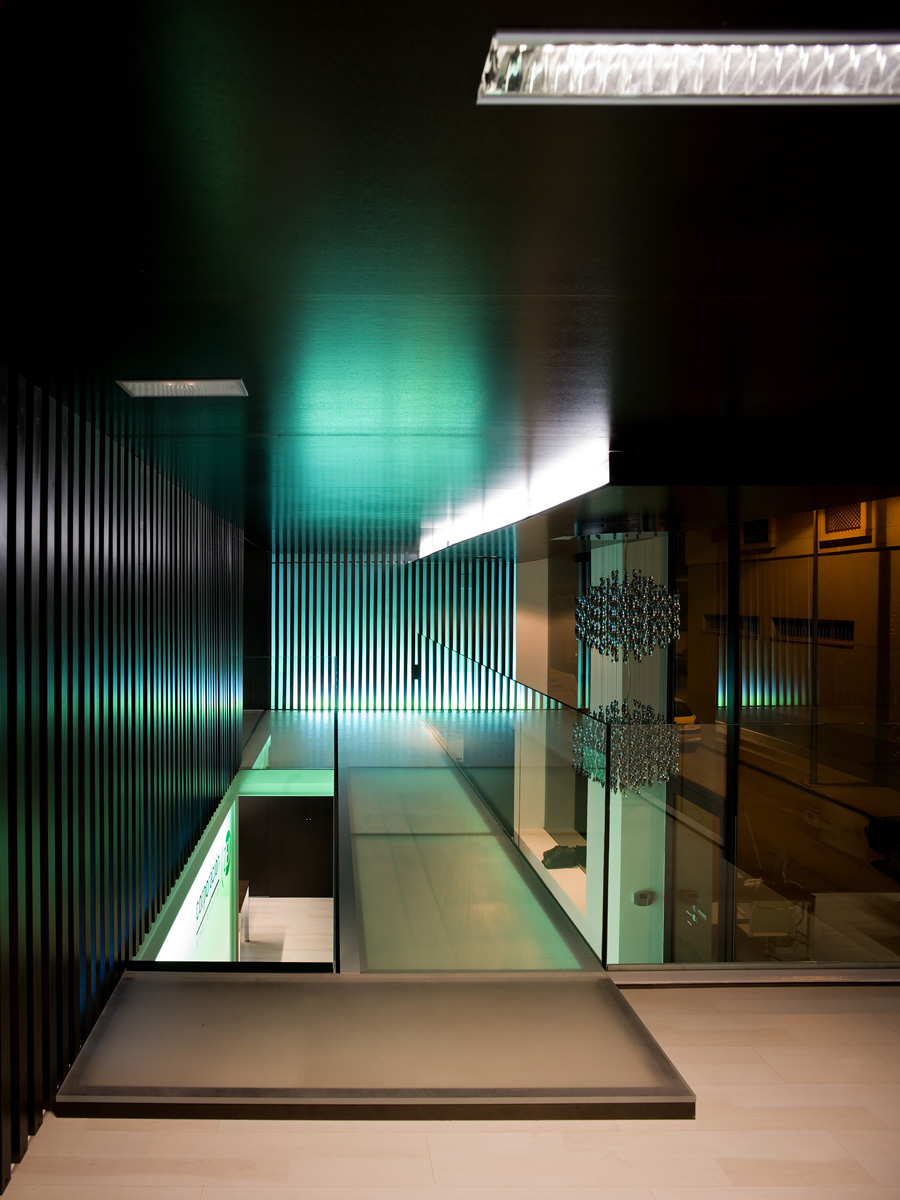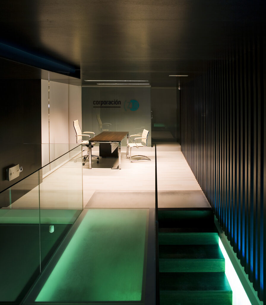 Los  espacios de trabajo son diáfanos y se conectan visualmente a través de separadores de vidrio. En los acabados de pared se combina la estructura metálica pintada en esmalte blanco con el panelado de madera oscura de los muebles, las celosías de listones de madera de pino tintada y el vidrio opal retroiluminado.